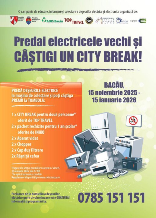 • Anunț Consiliul Județean Bacău: Desfășurare campanie de colectare a deșeurilor electrice, electronice și electrocasnice (DEEE): „BACĂUL RECICLEAZĂ DEȘEURI ELECTRICE – FII RESPONSABIL ȘI POȚI CÂȘTIGA UN CITY BREAK”